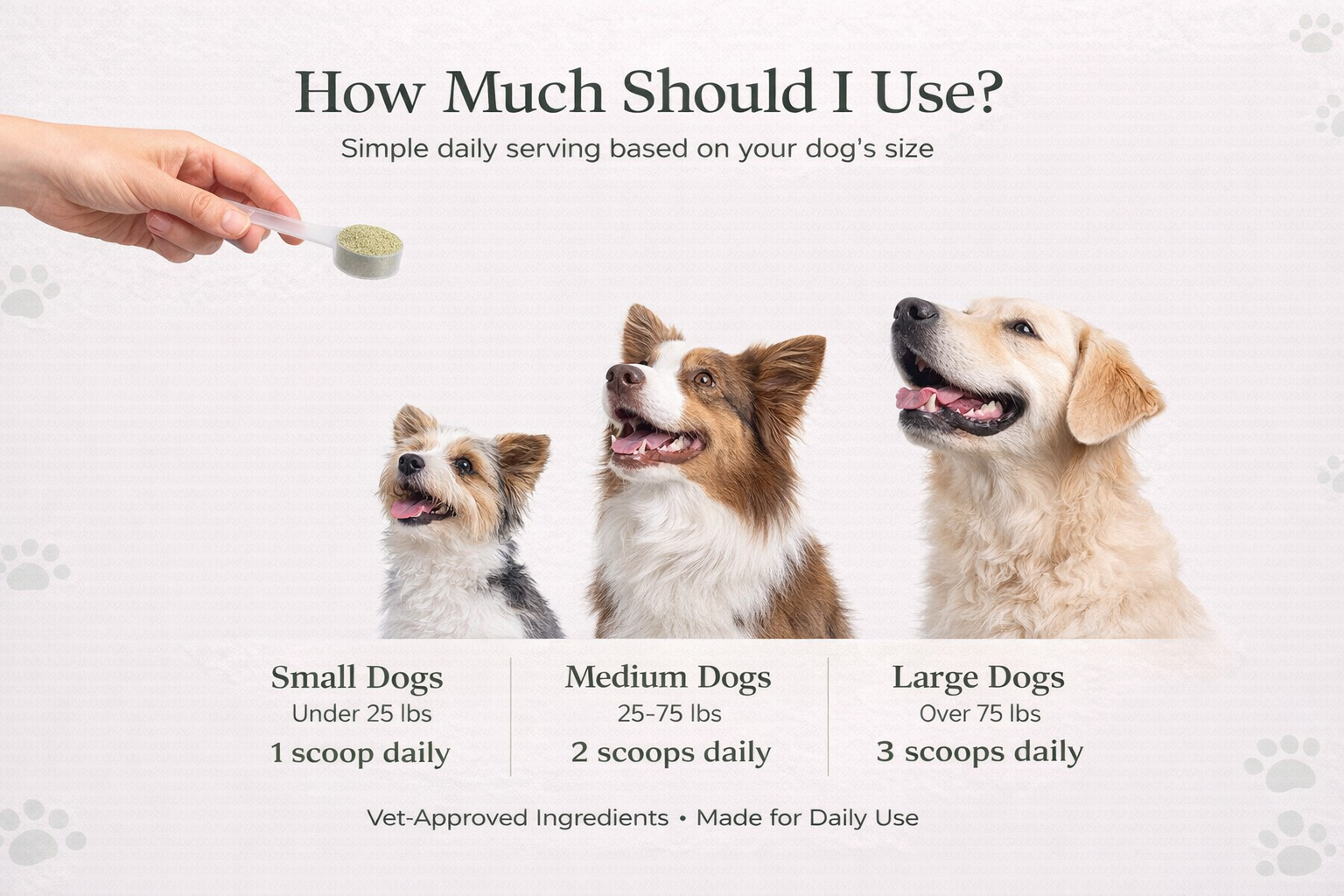 Simply sprinkle the recommended amount onto your dog’s food once per day.